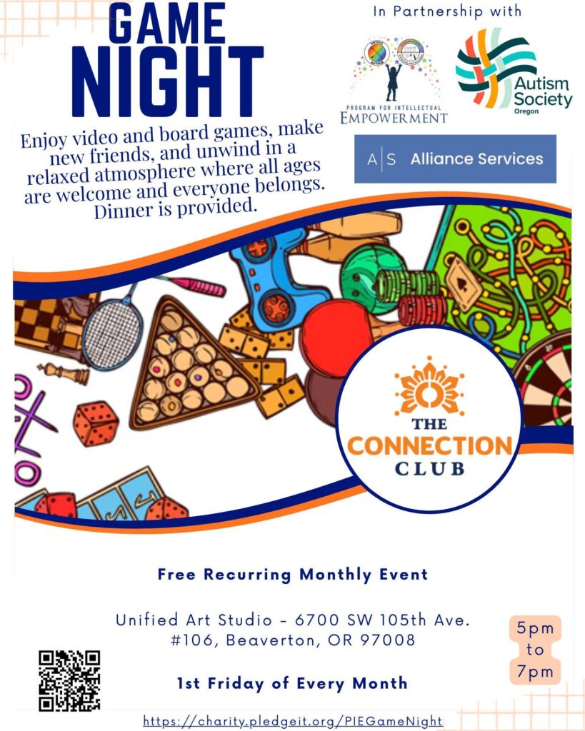 Join The Connection Club, in partnership with Autism Society of Oregon, Alliance Services, and the Program for Intellectual Empowerment, for a welcoming Game Night where everyone belongs! 💛
